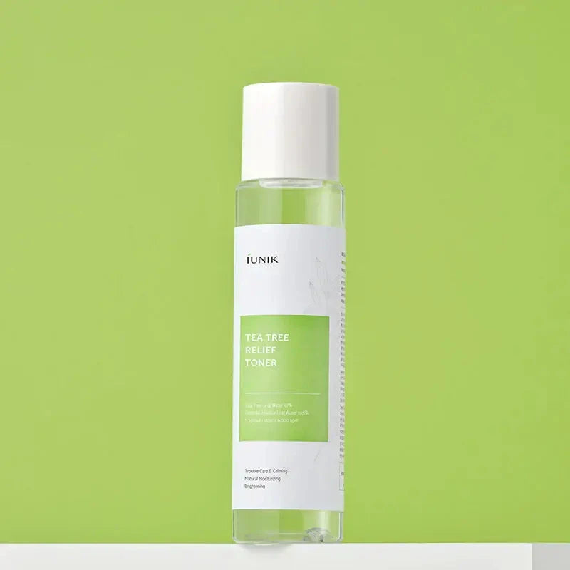 iUnik Tea Tree Relief Toner — gaivinantis tonikas su arbatmedžiu, skirtas į netobulumus linkusiai odai subalansuoti ir nuraminti.