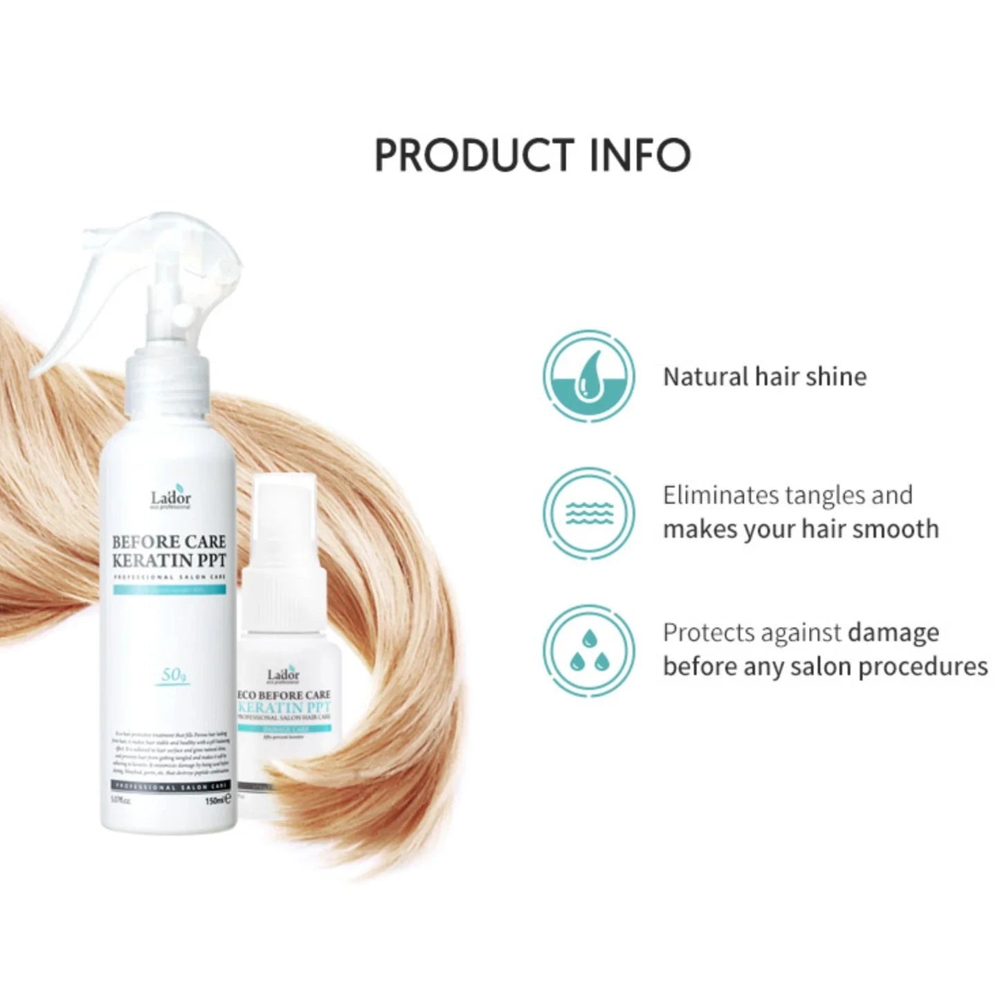 Lador Before CareKeratin PPT — atstatomoji purškiama keratino priemonė glotnesniems, elastingesniems ir labiau žvilgantiems plaukams.