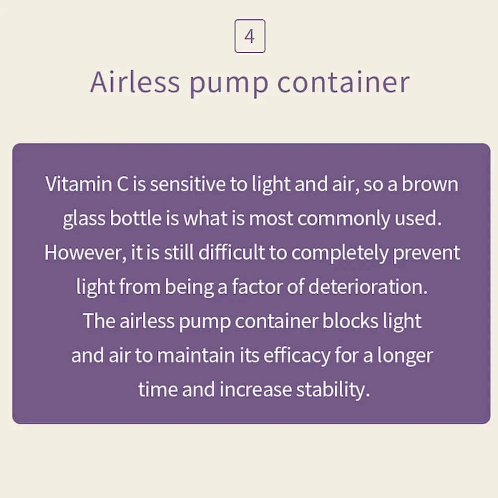 - 10% C vitaminas (3-O-Ethyl Ascorbic Acid) — stabilus C vitamino derivatas, padedantis suteikti odai skaistumo ir tolygesnės išvaizdos.