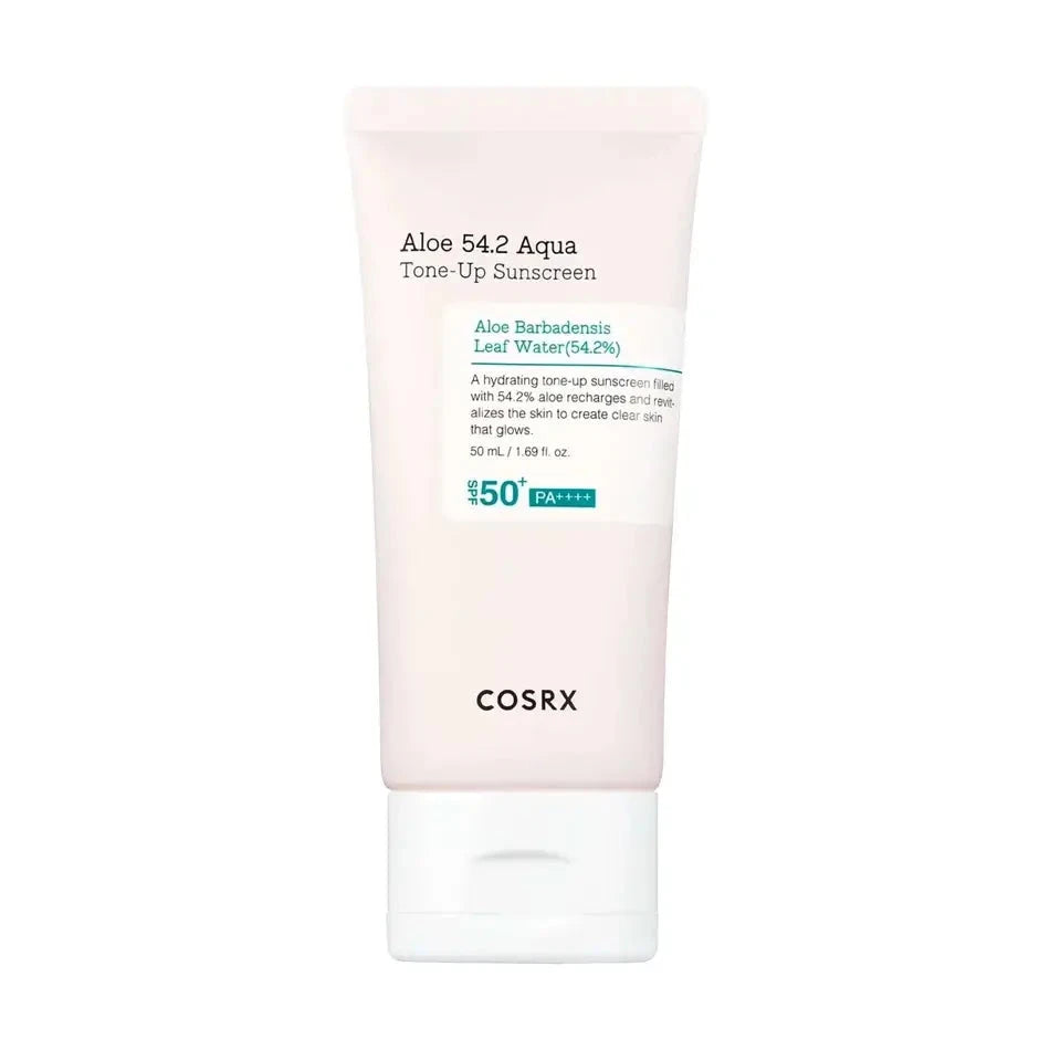 COSRX Aloe 54.2 Aqua Tone-Up Sunscreen — lengvos tekstūros veido apsaugos nuo saulės kremas su alaviju, suteikiantis drėkinimą ir švelnų „tone-up“ efektą.