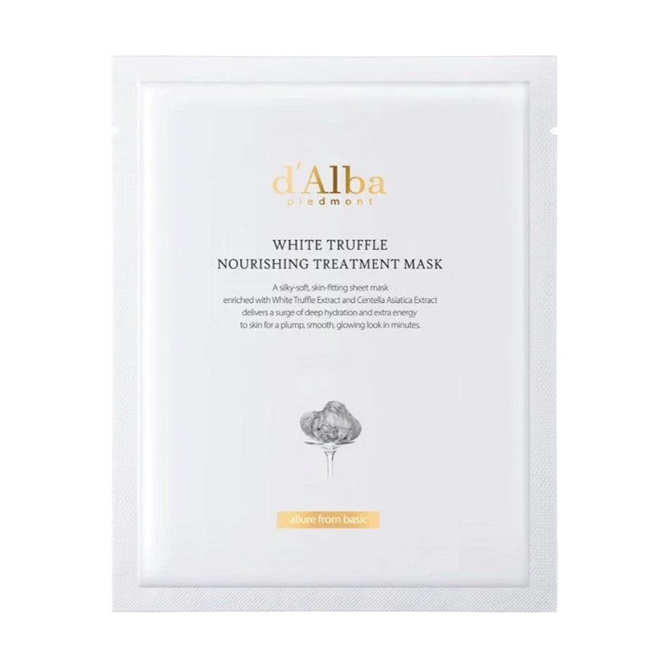 d'Alba White Truffle Nourishing Treatment Mask — maitinamoji lakštinė kaukė su baltaisiais triufeliais, skirta odos spindesiui ir glotnumui.