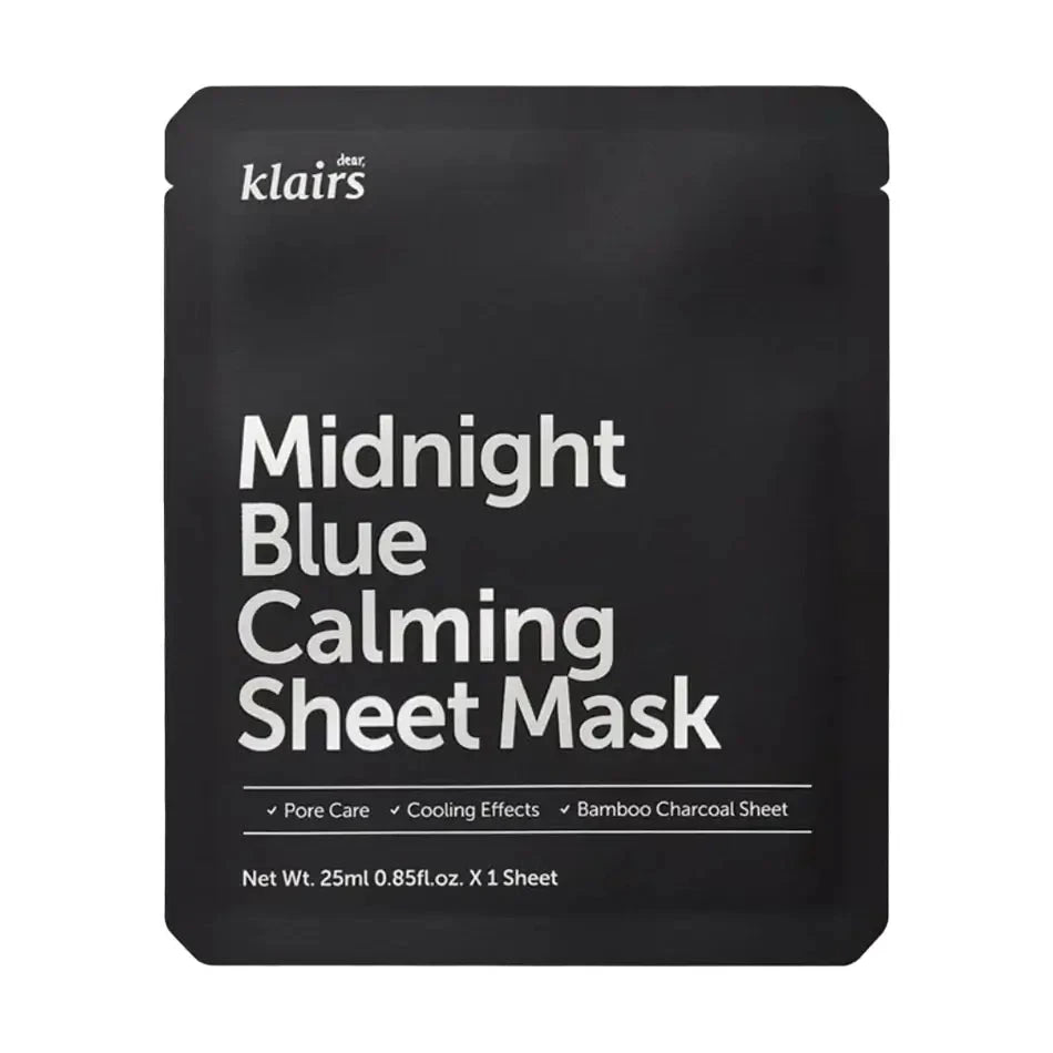 Dear Klairs Midnight Blue Calming Sheet Mask — vėsinanti, odą raminanti audinio kaukė, skirta komfortui ir gaivai.