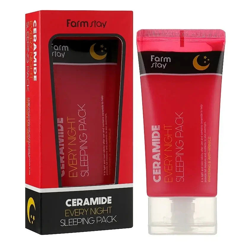 Nakts maska sejai FarmStay Ceramide Every Night Sleeping Pack — naktinė veido kaukė, skirta intensyviam odos drėkinimui ir maitinimui miego metu.