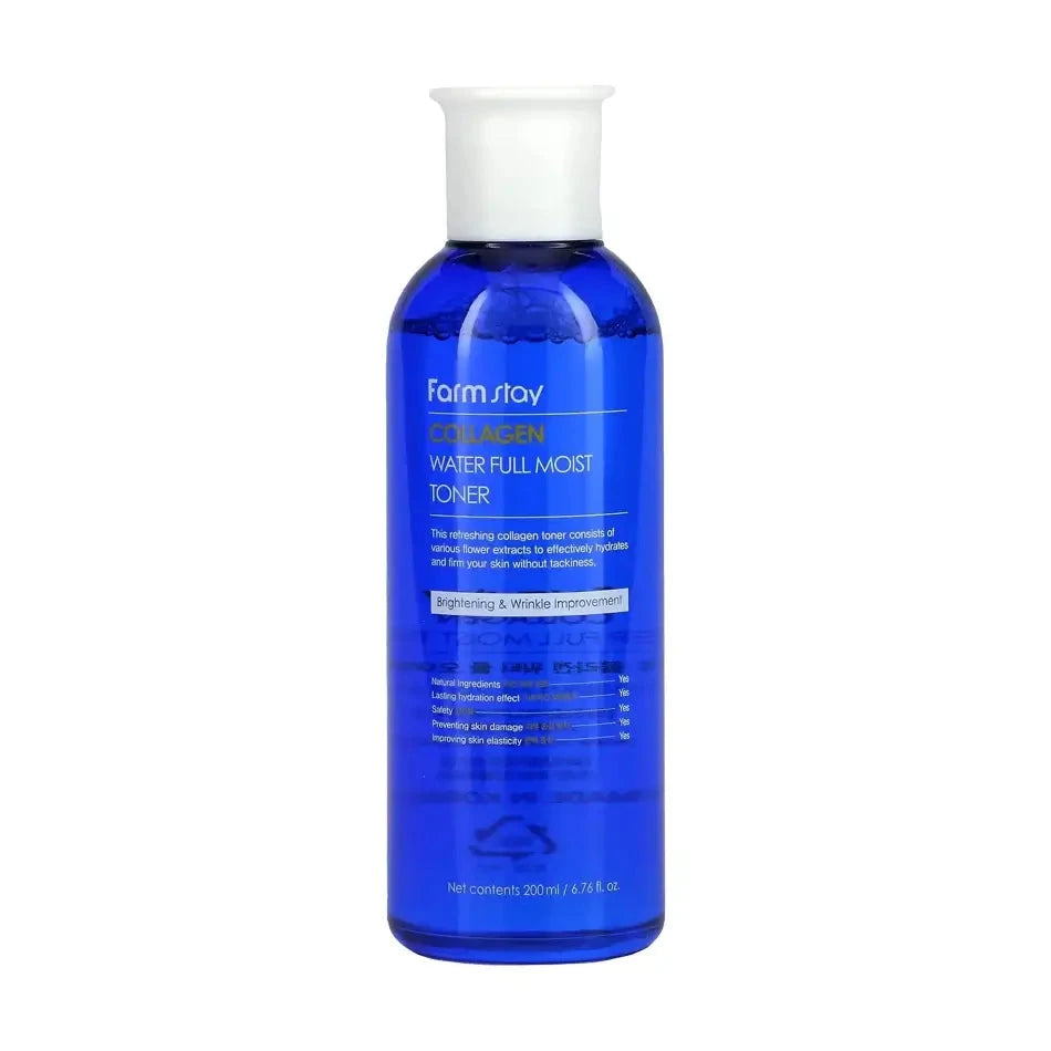 FarmStay Collagen Water Full Moist Toner — kolagenu praturtintas veido tonikas, padedantis intensyviai drėkinti ir suteikti odai elastingumo pojūtį.