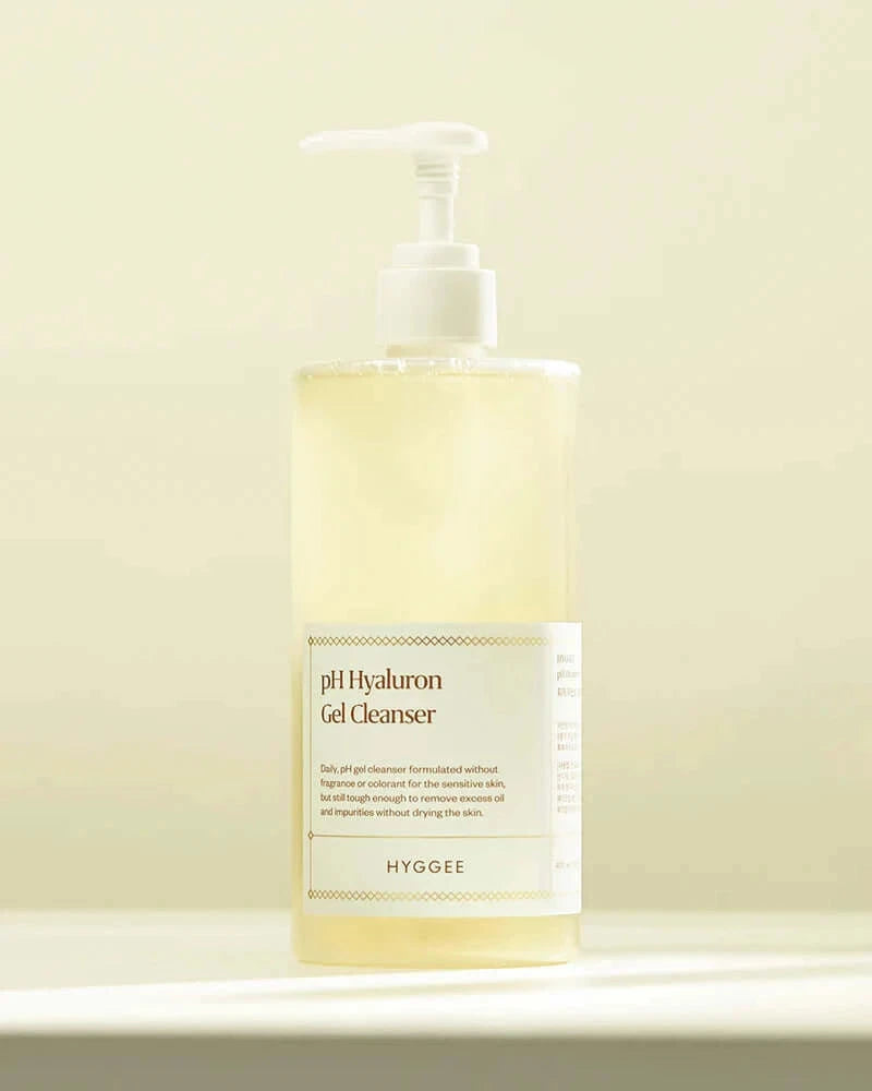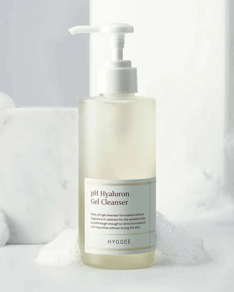 Hyggee pH Hyaluron Gel Cleanser — drėkinamasis veido prausimosi gelis su keramidais, švelniai pašalinantis nešvarumus ir makiažo likučius.