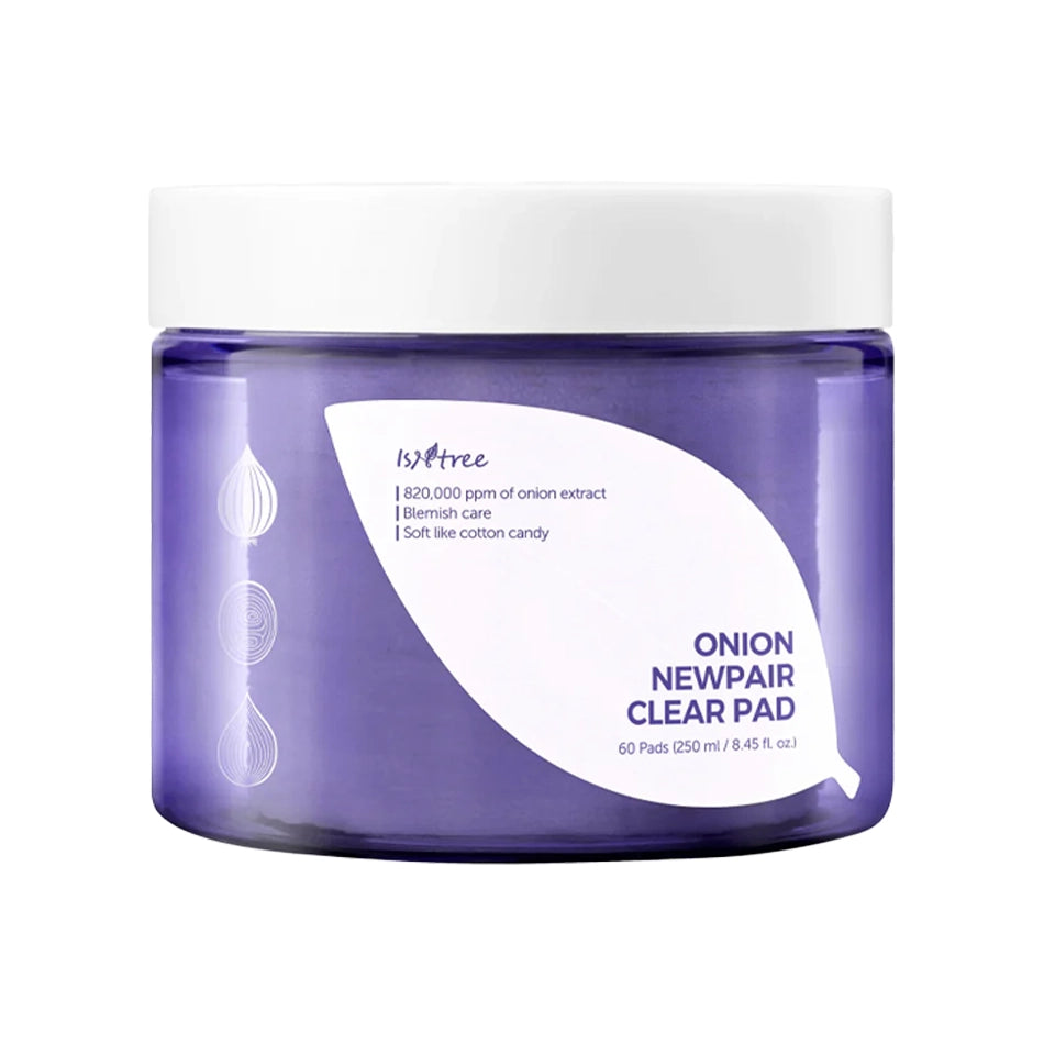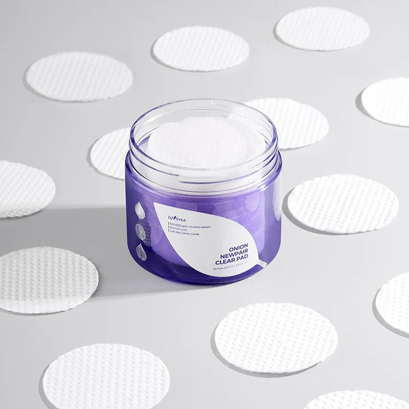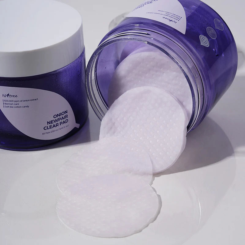Daugiasluoksniai diskeliai problematiškai odai su raudonuoju svogūnu Isntree Onion Newpair Clear Pad — švelnūs tonizuojantys diskeliai, padedantys pašalinti negyvas odos ląsteles ir sušvelninti šiurkštumą.