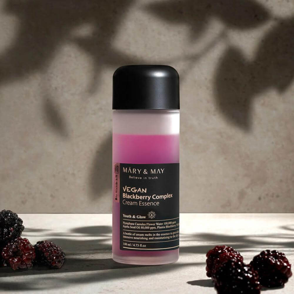 Mary&May Vegan Blackberry Complex Cream Essence — daugiafunkcė kremiška esencija, jungianti maitinamojo kremo komfortą ir gaivią toniko tekstūrą.