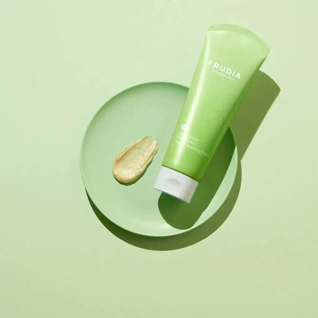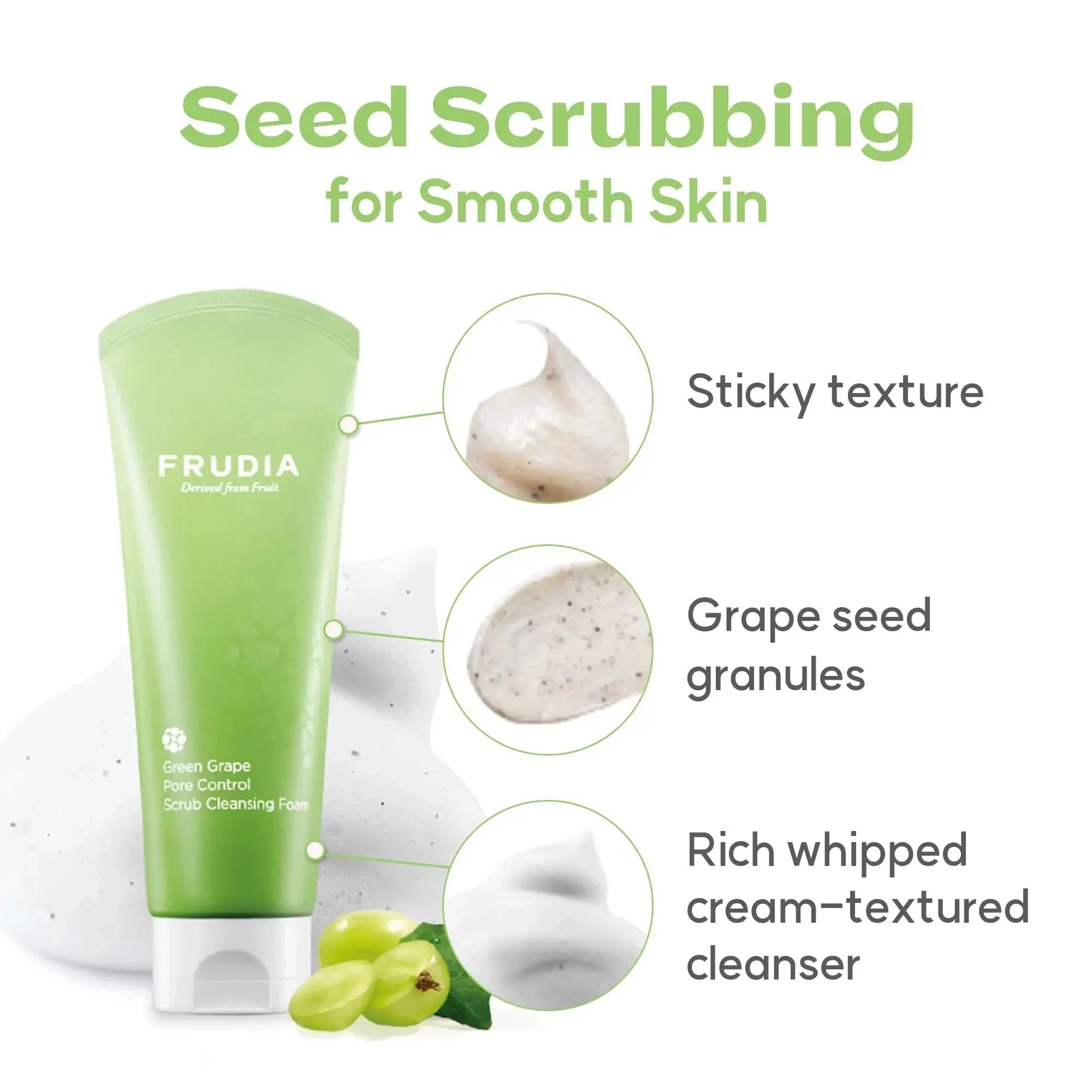 Putas-skrubis giliam porų valymui Frudia Green Grape Pore Control Scrub Cleansing Foam — putojanti valomoji priemonė su švelniu šveitimo efektu, skirta porų švarai ir gaivumo pojūčiui.