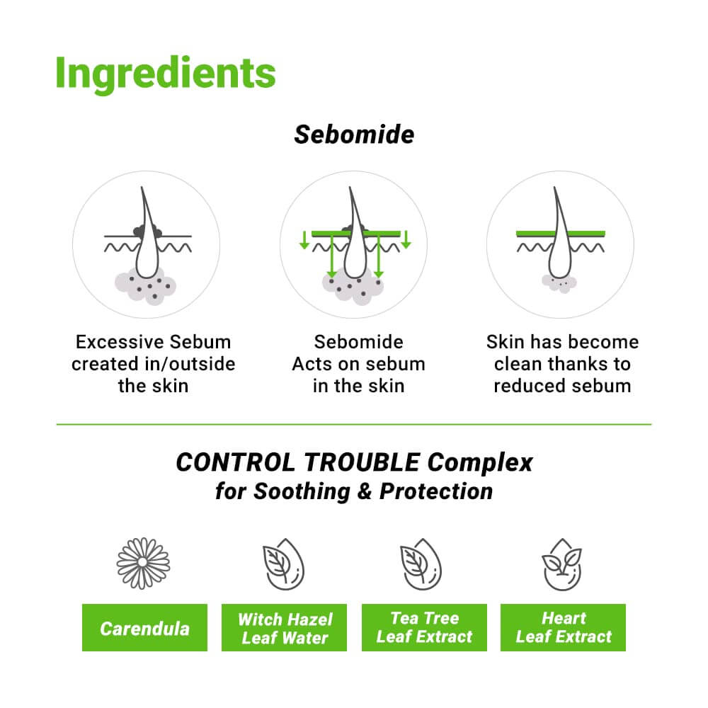 - Medetkos, hamamelio hidrolatas, arbatmedžio aliejus ir houttuynia ekstraktas — padeda nuraminti odą ir suteikia gaivos pojūtį probleminėse zonose.