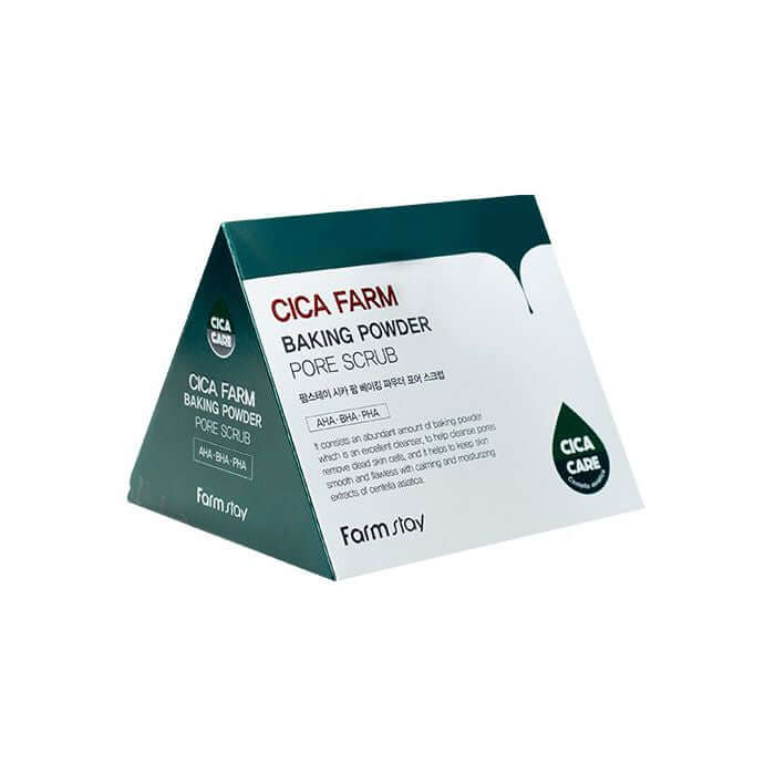 FarmStay Cica Farm Baking Powder Pore Scrub — piramidėse esantis veido šveitiklis su gotu kola (Centella asiatica) ir soda, skirtas švelniam porų valymui.