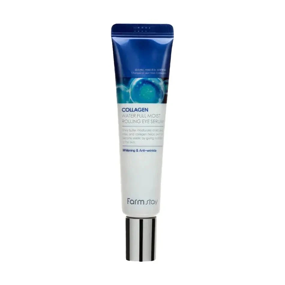 FarmStay Collagen Water Full Moist Rolling Eye Serum — kolageno serumas-rolleris paakių zonai, skirtas intensyviai drėkinti ir suteikti glotnesnės odos pojūtį.