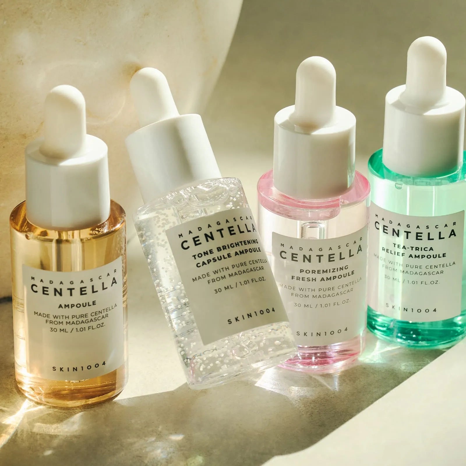 Rinkinį sudaro 4 ampulės po 30 ml: SKIN1004 Madagascar Centella Ampoule (30 ml), SKIN1004 Madagascar Centella Tone Brightening Capsule Ampoule (30 ml), SKIN1004 Madagascar Centella Poremizing Fresh Ampoule (30 ml) ir SKIN1004 Madagascar Centella Tea-Trica Relief Ampoule (30 ml).