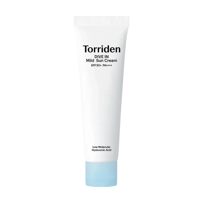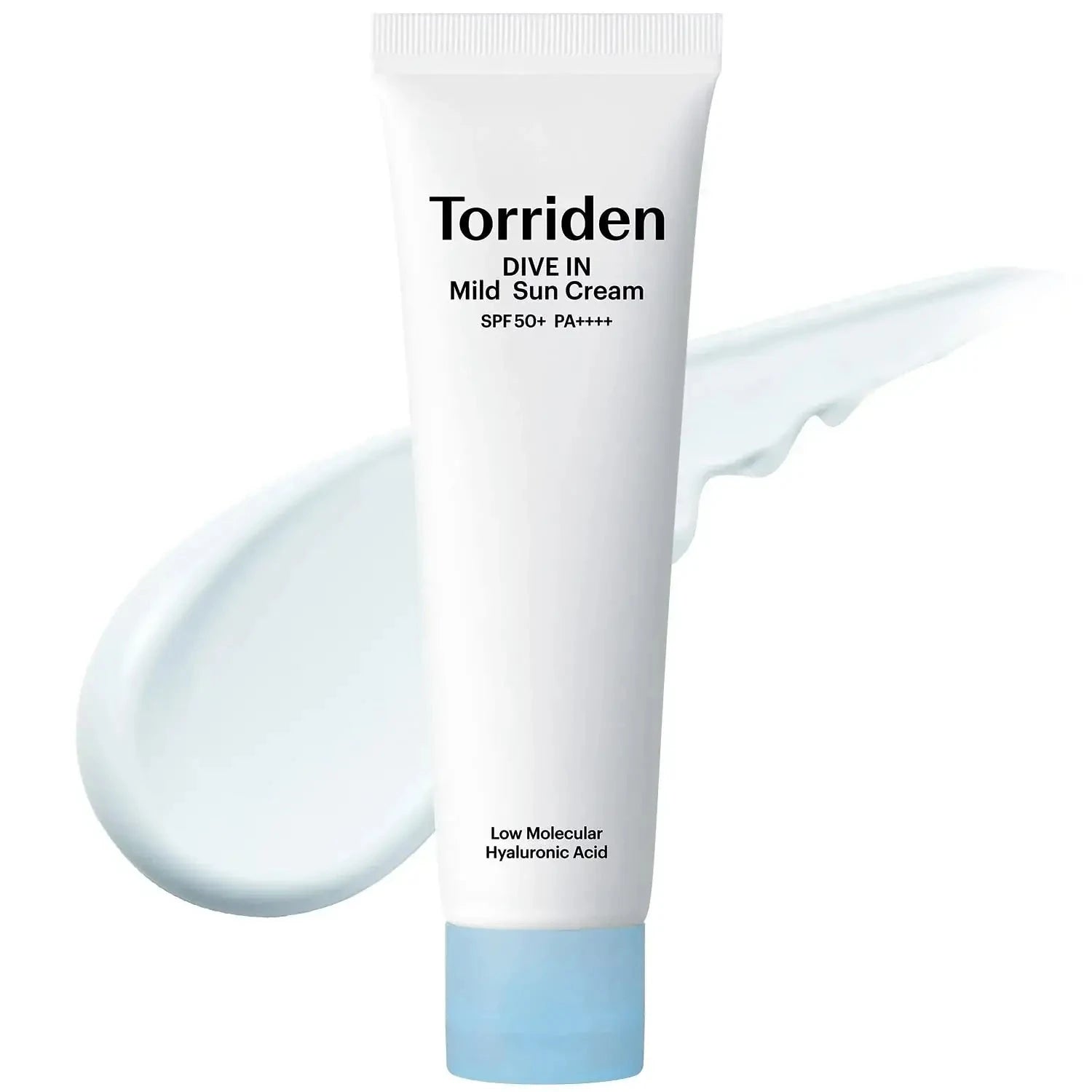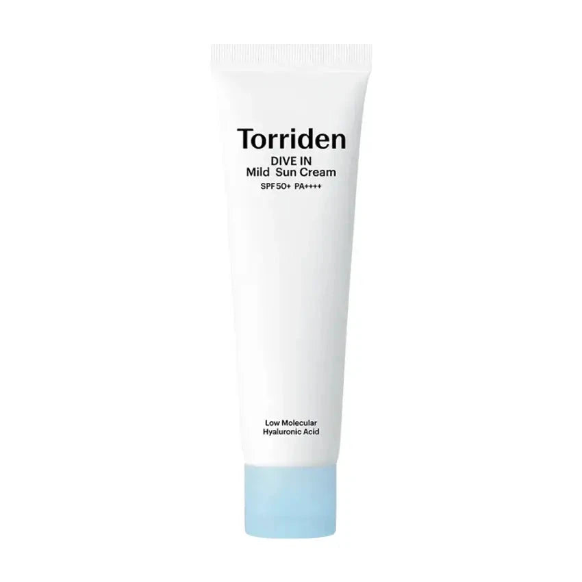 Torriden DIVE-IN Mild Suncream — mineralinis veido kremas nuo saulės su SPF 50+ PA++++, skirtas kasdienei, jautriai odai draugiškai apsaugai.