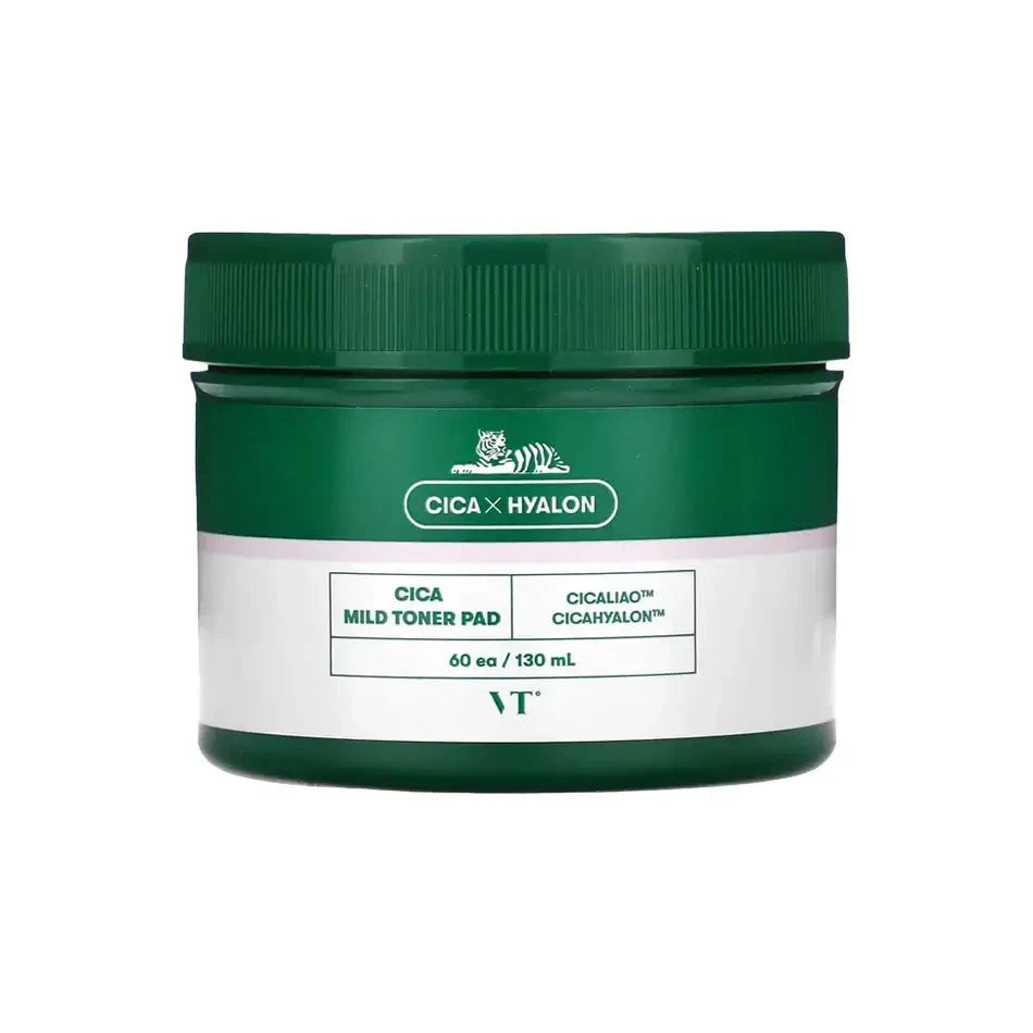 Vt Cosmetics Cica Mild Toner Pad — švelnūs toniko pagalvėlės, skirtos nuraminti jautrią odą ir patogiai paruošti ją tolimesnei priežiūrai.