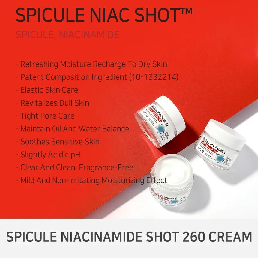 APLB Spicule Niacinamide Shot 260 Cream — kremas su niacinamidu ir mikroadatomis, kuris išlygina odos atspalvį, suteikia spindesio ir pagerina elastingumą.