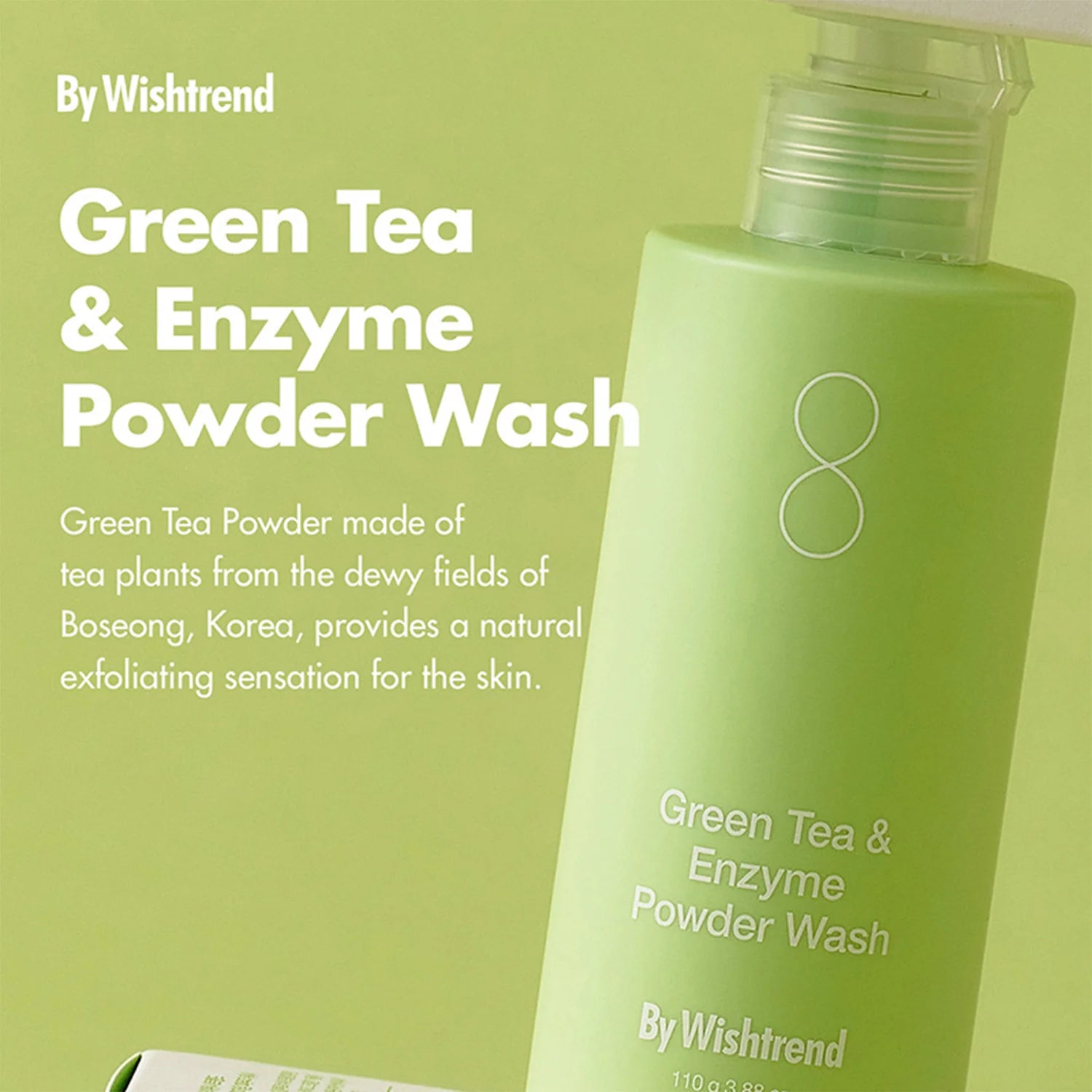 By Wishtrend Green Tea & Enzyme Powder Wash — švelni enziminė pudra su žaliąja arbata ir papainu, kuri valo odą, pašalina negyvas ląsteles ir suteikia jai glotnumo bei gaivumo.