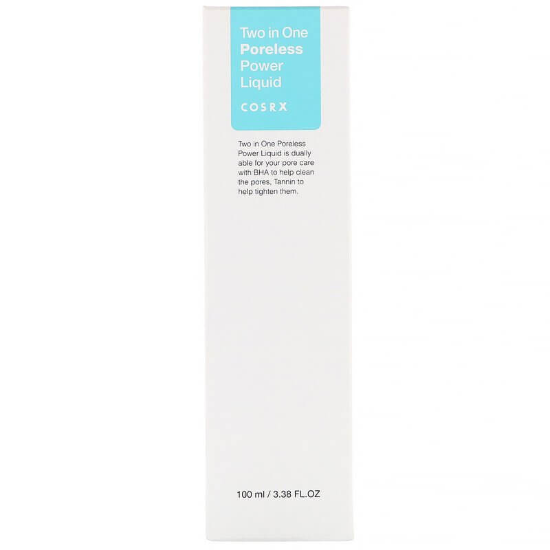 Esencija COSRX Two In One Poreless Power Liquid sukurta specialiai poroms valyti ir sutraukti. Priemonė puikiai drėkina, tačiau neapkrauna odos, kontroliuoja riebalinių liaukų veiklą, taip pat suteikia malonų vėsinimo efektą. Dėl mažo salicilo rūgšties kiekio (0,1%) ši esencija gali būti derinama su kitais gaminiais, kurių pagrindą sudaro AHA ir BHA rūgštys.