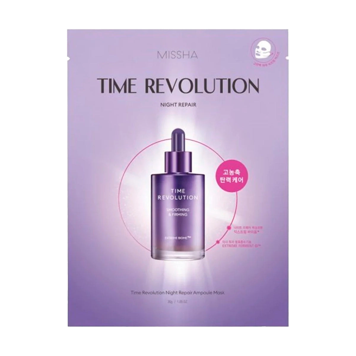 Missha Time Revolution Night Repair Ampoule Mask — intensyviai drėkinanti kaukė su probiotikais, atkurianti odos balansą, stangrumą ir suteikianti švytėjimo.
