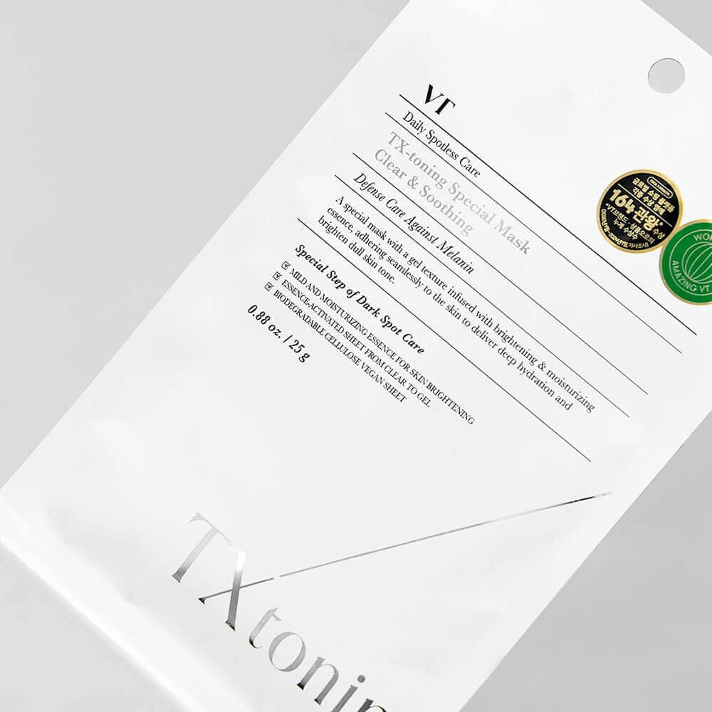 VT Cosmetics TX-Toning Special Mask — skaistinanti lakštinė kaukė su traneksamo rūgštimi ir niacinamidu, kuri padeda sumažinti pigmentines dėmes, suvienodina odos atspalvį ir suteikia natūralų spindesį.